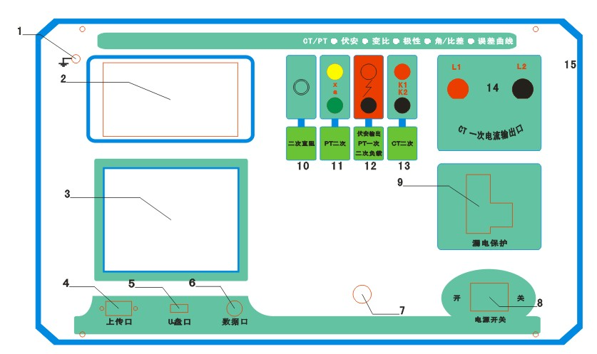 11.PT 二次輸入口   12.交流電壓/負載測試輸出口    13.CT 二次輸入口