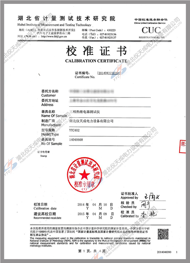 轉(zhuǎn)載:"YTC402三相熱繼電器測(cè)試儀鑒定證書" 請(qǐng)注明來(lái)源于儀天成電力。 更多技術(shù)問(wèn)題請(qǐng)致電儀天成電力客戶服務(wù):027-87876585,技術(shù)部專線:027-87876585,在線客服:719388481